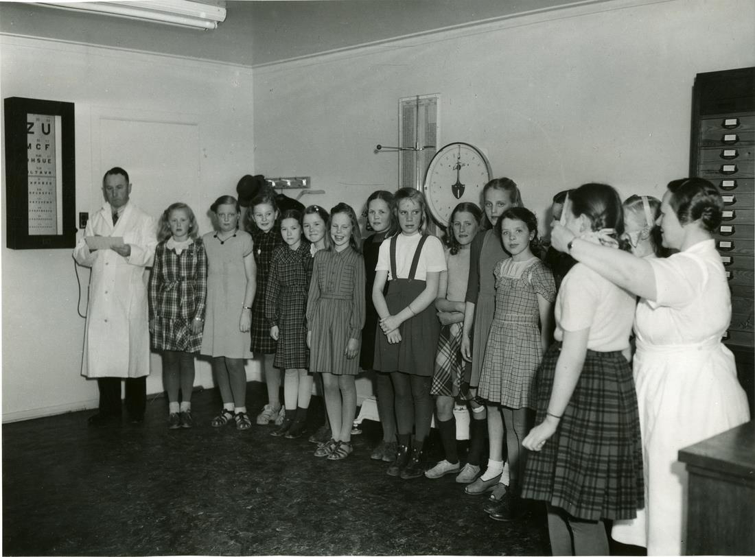 Læknisskoðun í barnaskóla. Hópur telpna bíður í röð eftir sjónmælingu, hjúkrunarkona bregður blaði fyrir annað auga telpunnar sem er í sjónmælingu.