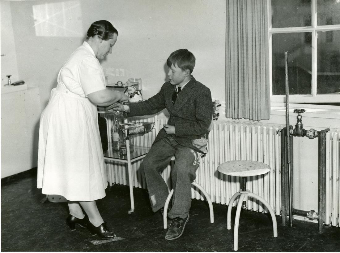 Læknisskoðun í barnaskóla. Hjúkrunarkona tekur blóðprufu úr dreng.