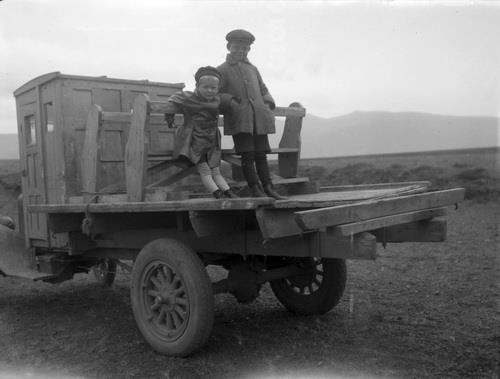 Tveir drengir, væntanlega Gunnar og Geir Agnar Zoëga, standa upp á palli á bíl sem er með tveimur bekkjum. Óþekkt fjöll í fjarska.