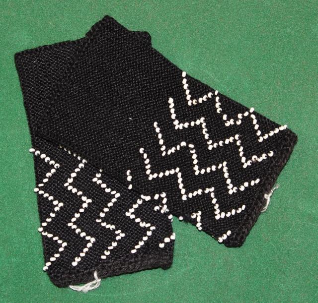 Svartir garðaprjónaðir perluprjónaðir smokkar, með hvítum perlum frekar stórum.