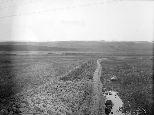 Jökulsárbrú á Sólheimasandi. 1933. Varnargarður. Horft eftir varnargarði sem tekur sveig. Í baksýn er jökull.