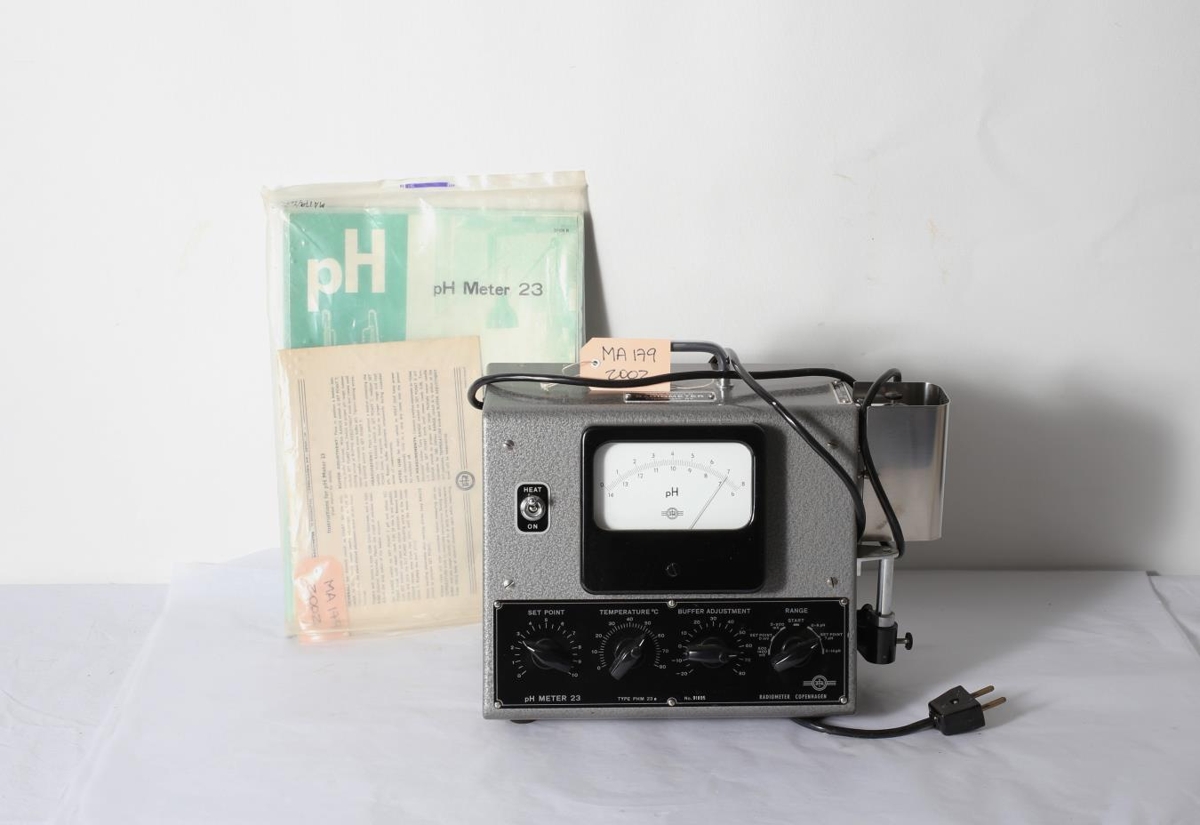 Grátt svart og krómað ferkantað tæki, mjókkar upp. Framan á er aflestrarmælir (pH), rofi (on/heat) og fjórir stillingatakkar (set point, temperature °C, buffer adjustment, range). Handfang er ofan á og rafmagnssnúra út úr vinstri hlið, efst. Plastumslag með 3 grænum og bláum leiðbeiningabæklingum og 1 hörðu spjaldi með notkunarleiðbeiningum og framleiðsluupplýsingum um sýrumæli (MA-2002-179-1). Notað við sýrumælingar í jarðvegi og votheyi á tilraunabúinu á Skriðuklaustri.