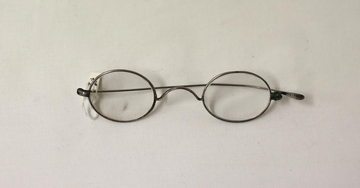 Kringlótt gleraugu með málmumgjörð. Umgjörðin er brotin á öðru auganu og það vantar aðra spöngina. Úr skrifborði Vigfúsar Sigurðssonar ljósmyndara frá Egilsstöðum í Fljótsdal.