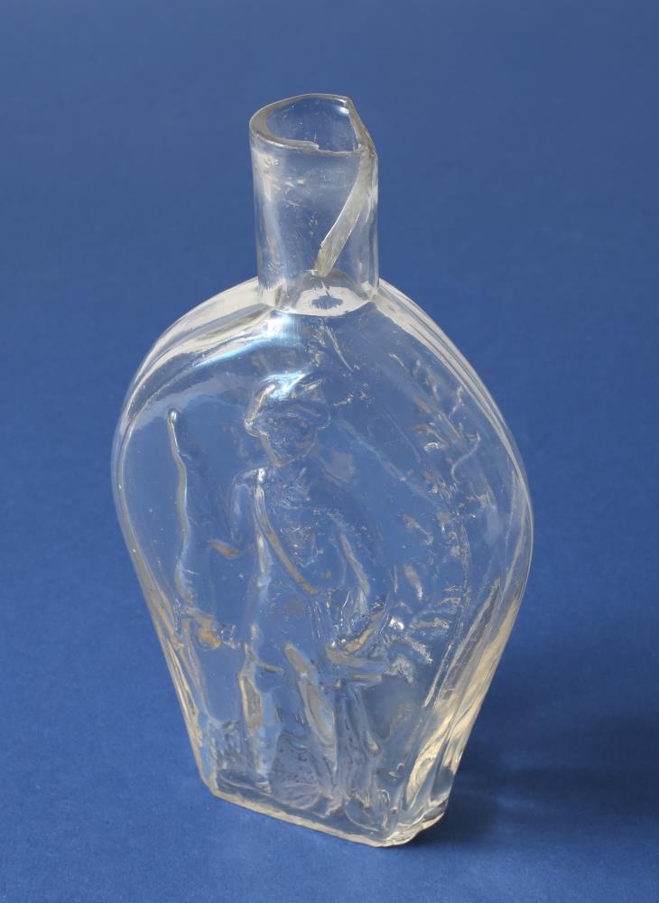 Glær glerpeli eða flaska sporöskjulaga ofan til, fyrir neðan fremur háan stút en brotið er út úr stútnum. Einnig er stjörnusprunga í botni. Upphleypt mynstur í gleri á báðum hliðum. Annars vegar veiðimaður með kanínu, hinum megin eru sveigir með laufblöðum. Þór Magnússon sendi á sínum tíma fyrirspurn og mynd til Kastrup og Holmegaards Glasværker A/S. Í svarbréfi frá 25.01.1979 segir eftirfarandi: "Þetta er alveg örugglega Kastrupveiðiflaska, hennar er getið í vörulista fyrst 1886 en síðast í vörulista frá 1924 er hennar ekki getið. Þ.e.a.s. hún er ekki eldri en frá 1886. Það er erfitt að átta sig eftir myndinni en ég held að flaskan sé af elsta hluta framleiðslunnar fyrir 1900 en það er ekki hægt að segja með vissu. Hún getur verið nokkrum árum eldri því hún var í framleiðslu í nokkurn tíma áður en hún kom í vörulistann. Vörulistinn frá 1886 er sá elsti frá Kastrup Glasværk, svo við getum ekki rakið aldur hennar lengra aftur. Við skulum hafa hana sem næst 1880" (Lausleg þýðing). Flaskan kom upp ásamt fleiri munum í trolli Barkar N.K. úti fyrir Austfjörðum á árunum milli 1970-79 og voru munirnir sendir á Þjóðminjasafnið. Þáverandi safnvörður Minjasafns Austurlands, Gunnlaugur Haraldsson, fékk flöskuna aftur austur til MA. Gunnlaugur segir flöskuna trúlega vera úr dönsku kaupskipi frá síðari hluta 19. aldar sem sokkið hafi úti fyrir Austfjörðum. Auk "jagerflöskunnar" komu tólf hattar og ræfill af gömlum tréskó upp í sama trolli. Annað heiti "Jagerflaska"; Veiðimannavasapeli.