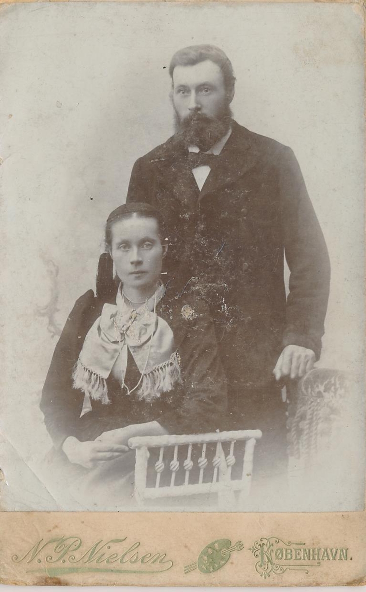 Ljósmynd úr fórum Snorra Ólafssonar frá Selfossi. Á myndinni eru hjónin Jón Sturlaugsson og Vilborg Hannesdóttir frá Vinaminni á Stokkseyri. Jón var formaður og hafnsögumaður á Stokkseyri. Vilborg var fædd á Skipum í Stokkseyrarhrepp.