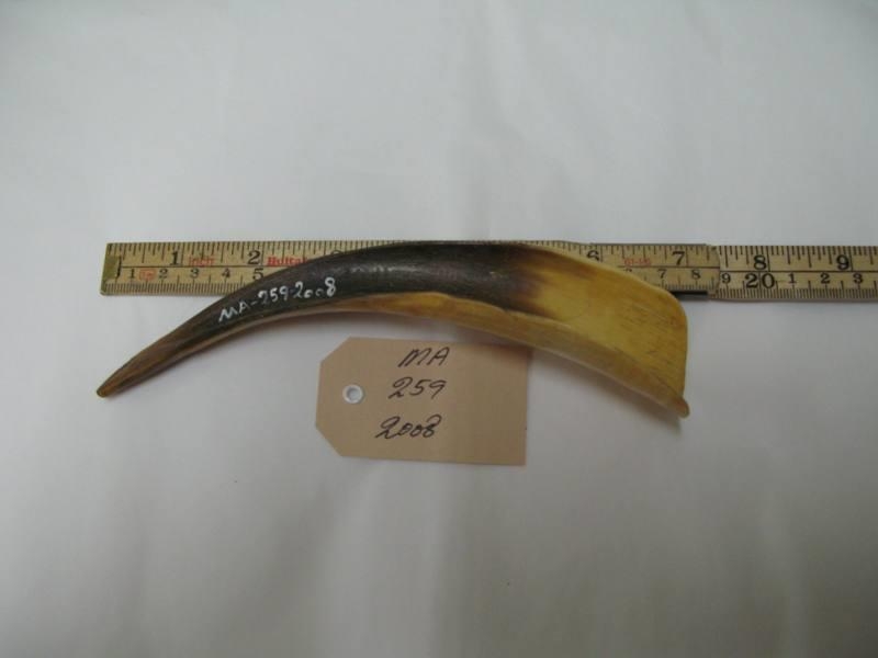 Skóhorn úr helmingi af horni. Hornið er ljósgult með gati í mjórri endanum til að hengja það upp.