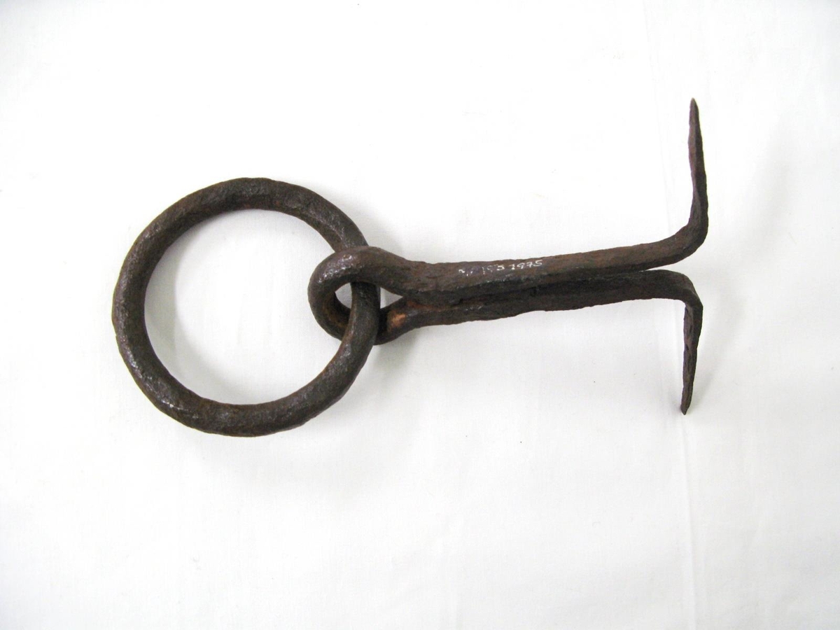 Járnhringur með festingu sem hringurinn leikur í. Úr lestarlúguhlera. Úr búi Gísla Þorvarðarsonar í Papey.