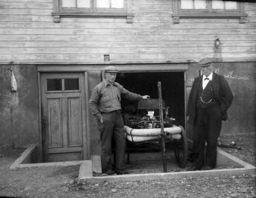 Sauðárkrókur. Tveir menn við brunadælu í kjallara gamla barnaskólans á Sauðárkróki þar sem nú er Náttúrustofa Norðurlands vestra. Þar var fyrsta slökkvistöðin á Sauðárkróki. Til vinstri við dæluna er Sigfús Jóhannsson (1899-1952) frá Torfustöðum í Svartárdal í Húnavatnssýslu en lengi búandi á Sauðárkróki og jafnan kallaður Fúsi Torfustaða. Hann var vélgæslumaður á Sauðárkróki og hefur líklega séð um brunadæluna en þetta var fyrsta brunadælan á Sauðárkróki. Sá reffilegi til hægri er hins vegar Steindór Jónsson smiður á Sauðárkróki. Hann var fyrsti slökkviliðsstjórinn.