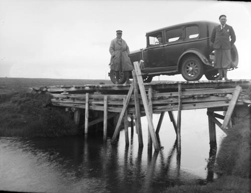 Óþekkt timburbrú yfir sýki eða straumlitla á. Bíll úti á brúnni, maður situr undir stýri á honum og tveir menn standa úti á brúnni. Maðurinn lengst til hægri Magnús Jochumson.