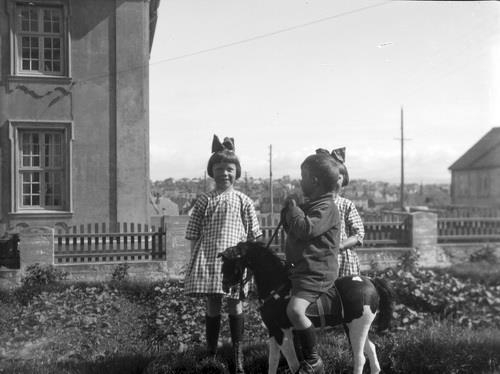 Í garðinum á Túngötu 20. Tvíburarnir Bryndís og Helga (Geir Agnar er fyrir andliti hennar) og Geir Agnar, hann situr á leikfangahesti og horfir á systur sínar sem standa bak við hann. Bak við þau er grindverkið sem tilheyrði Túngötu 20. Vinstra megin á myndinni er húsveggur með gluggum á tveim hæðum, væntanlega Túngata 18. Hægra megin sést einnig glitta í hús. Í fjarska eru Þingholtin.