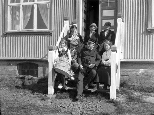 Efri-Hvoll. Fólk situr á tröppum fyrir utan bæjarhúsið. Þetta er sama hús og á mynd GZ-758. Efri röð frá vinstri: 1) Ragnheiður Ingibjörg Einarsdóttir (kona Björgvins) 2) óþekkt kona, væntanlega erlend 3) Hólmfríður. Neðri röð frá vinstri: 1) Elísabet Vigfúsdóttir 2) óþekktur maður, væntanlega erlendur 3) Björgvin Vigfússon sýslumaður 4) Helga Guðríður Vigfúsdóttir.