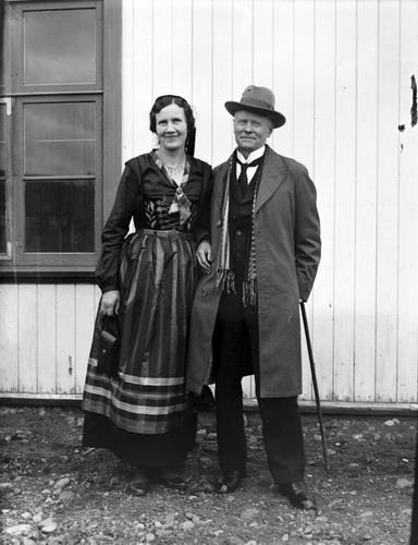 Gísli Sveinsson sýslumaður og Guðrún Einarsdóttir kona hans. Þau standa fyrir framan hús. Sést í ljósan vegg og glugga vinstra megin.