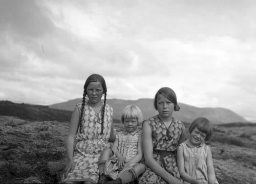Þingvellir. Fjórar stúlkur sitja í mosa. Systurnar 1) Helga 2) Ingileif 3) Bryndís 4) Áslaug. Þessi mynd er tekin sumarið 1932. Þá er Helga orðin veik, hún deyr 10. september þetta sama ár. Ármannsfell í baksýn.
