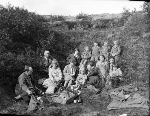 Þingvellir. Lautarferð. Fjöldi fólks á mynd. Efri röð frá vinstri: 1) GZ 2) „Ella Jóns“ 3) Hallvarður Valgeirsson 4) Geir Agnar 5) óþekktur drengur 6) Gunnar. Neðri röð: 7) Valgeir Björnsson 8) Eva Björnsson 9) óþekkt kona 10) Ingileif 10) Hólmfríður 11) Bryndís 12) Helga 13) Áslaug.