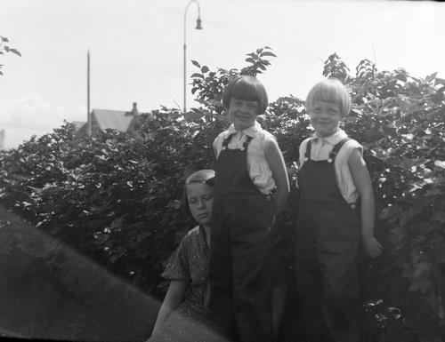 Þrjár stúlkur upp við runna. Bryndís situr og er með lokuð augun. Áslaug og Ingileif standa, þær eru báðar í smekkbuxum. Þetta er væntanlega í garðinum að Túngötu 20. Í baksýn sést í húsþök.