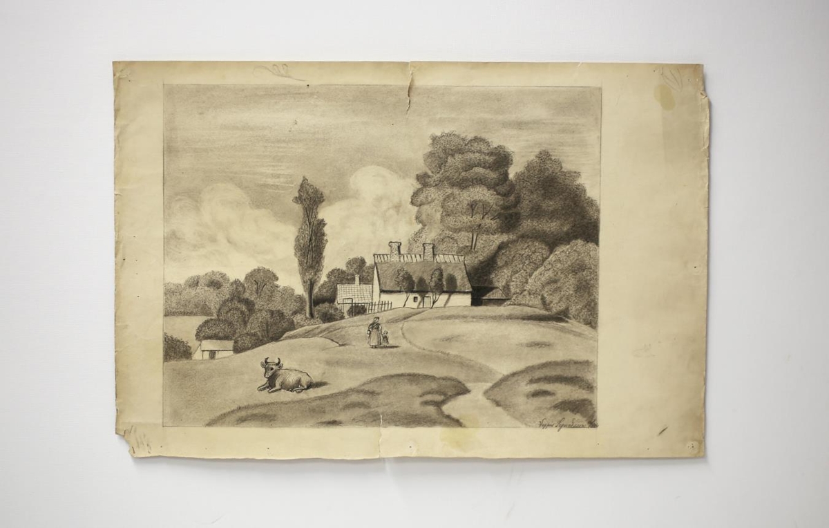 Blýantsteikning af erlendum bóndabæ. Á myndinni leiðir kona litla stúlku og kýr liggur og jórtrar. Úr eigu Vigfúsar Sigurðssonar (f.3.08.1880 d.13.09.1943) frá Egilsstöðum í Fljótsdal.