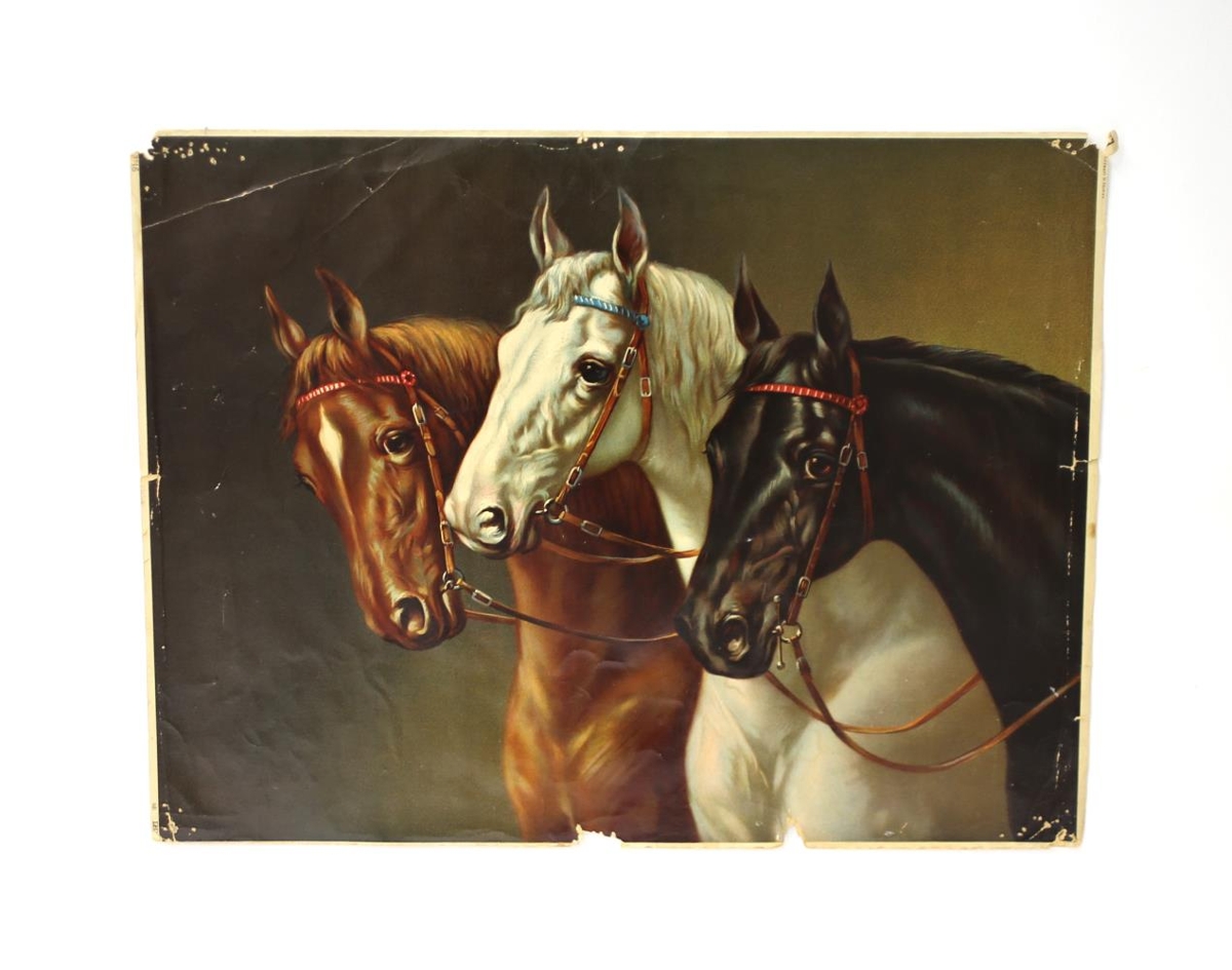 Eftirprentun af málverki af þremur hestum, rauðum, gráum og brúnum. Allir hestarnir eru með beisli. Myndin hefur verið fest upp með teiknibólum og því eru göt á hornum og myndin svolítið rifin hér og þar. Úr eigu Sigurðar Vigfússonar, sonar Vigfúsar Sigurðssonar ljósmyndara.