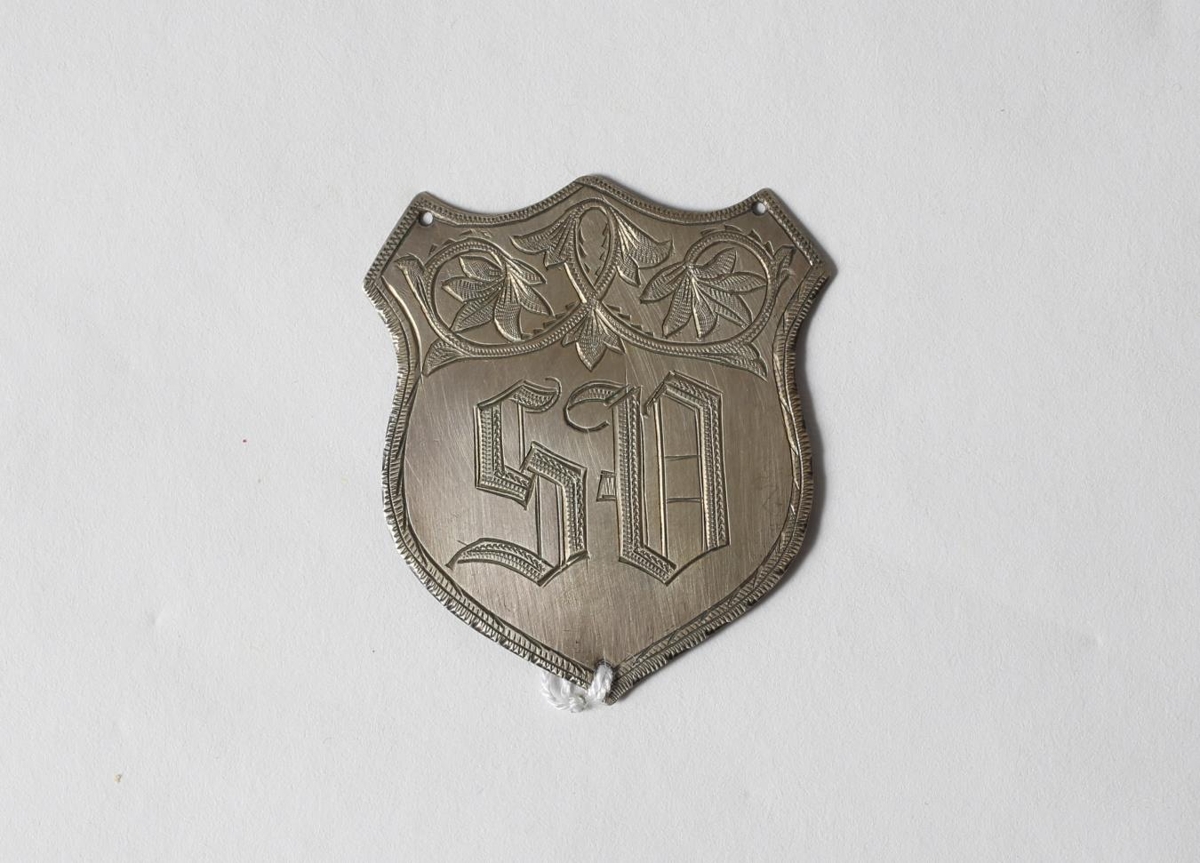 Lítill silfurskjöldur (5,2 cm x 4.8 cm). Skjöldur til að sauma inn í frakka og á hann eru grafnir stafirnir S.V. sem er fangamark Sigurðar Vigfússonar. Úr skrifborði Vigfúsar Sigurðssonar ljósmyndara frá Egilsstöðum í Fljótsdal.