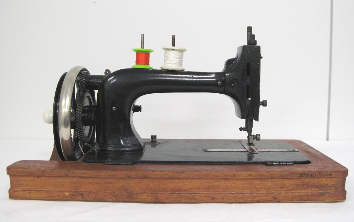 Handsnúin saumavél. Ekkert sjáanlegt vörumerki. Tvö tvinnakefli fylgja, hvítt J&P coats grænt með rauðum tvinna Mölnlycke. Vélina átti Helga Símonardóttir, fóstra Haraldar (gefanda), og Sigurður Pálsson maður hennar. Þau bjuggu á Sólheimum í Seyðisfirði.