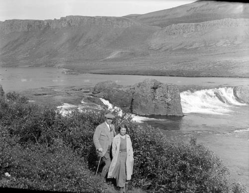 Paradís við Norðurá, Laxfoss í baksýn. John Fenger og Ída standa í forgrunni myndarinnar. John styður sig við staf. Fossinn í baksýn.