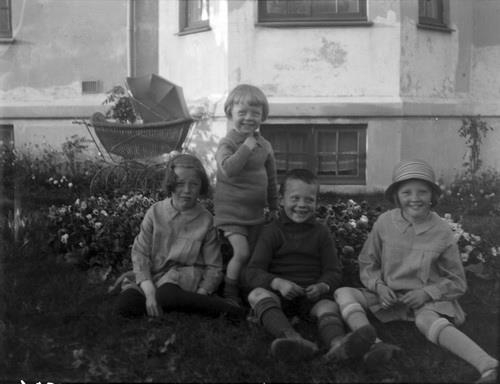 Í garðinum að Túngötu 20. 1) Bryndís 2) Gunnar 3) Geir Agnar 4) Helga. Vinstra megin í baksýn er barnavagn sem er væntanlega fyrir Áslaugu sem fæðist í janúar þetta ár (1926). Hann stendur upp við húsvegginn sem er í baksýn á myndinni. Með myndinni stendur „Börnin 1926".