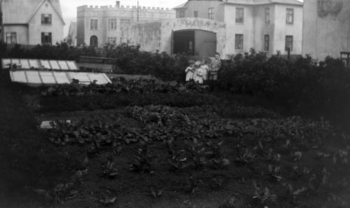 Í bakgarði Túngötu 20. Fjögur börn standa í fjarlægð fyrir miðri mynd. Þau eru Gunnar, Áslaug, Ingileif og væntanlega Helga Magnúsdóttir. „Kastala“húsið er Öldugata 4 og lengst til vinstri er Öldugata 6. Merkt Ýmislegt 1930.