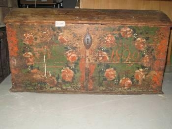 Græn og rauð kista. Skræpótt kista með máðu rósamynstri og áletrun: 1899. Eigandi kistunnar var Rósa Bergsdóttir (Egilsstöðum), systir Jóns Bergssonar bónda þar. Notuð á æskuheimili Ingunnar. "Rúsínu- eða sveskjukista". Í kistunni var geymt fínerí og hugsanlega fínt koníak þegar það átti við.