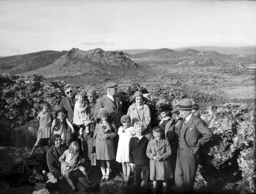 Lautarferð í óþekktu landslagi, gæti verið í Rauðhólum. 1) Áslaug 2) Helga Magnúsdóttir 3) Magnús Jochumson 4) Sigrún Magnúsdóttir 5) Sigrún Magnúsdóttir 6) Guðrún Geirsdóttir 7) Valgeir Björnsson 8) Dagný Valgeirsdóttir 9) Björg Valgeirsdóttir 10) Eva Björnsson 11) óþekktur drengur 12) Hallvarður Valgeirsson 13) Bryndís 14) óþekktur maður. Fyrir framan: 15) Hólmfríður með 16) Ingileif í fanginu. Börnin og fleira 1932.