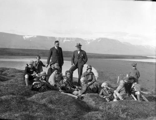 Aftari röð: 1) Hilmar Fenger 2) Áslaug leiðir 3) Geir Zoëga 4) Hólmfríður með Ingileif í fanginu fyrir framan GZ 5) Valgeir Björnsson stendur. Fremri röð: 1) Geir Agnar liggur 2) Helga Zoëga 3) Helga Ída Fenger 4) Bryndís Zoëga 5) Björg Valgeirsdóttir 6) Eva Björnsson 7) Dagný Valgeirsdóttir 8) Hallvarður Valgeirsson 9) Gunnar Zoëga 10) Garðar Emil Fenger 11) Geir Ulrik Fenger. Geldinganes og Esjan í baksýn.