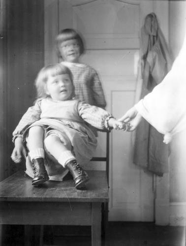 Tvíburarnir, Helga situr á stól og hönd sem sést ekki hver á heldur í hönd hennar. Bryndís stendur fyrir aftan. Myndin er hreyfð. Á bakvið er hurð sem frakki hangir á dyrastafnum á.