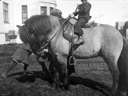 Í garðinum við Túngötu 20. Drengur á hestbaki, sést ekki í andlit hans, væntanlega Geir Agnar. Sést í fætur tveggja stúlkna sem eru eins klæddar, líklega tvíburarnir Bryndís og Helga. Auk þess sést í hatt og kápu en ekki í andlit konu. Barnavagn er upp við húsið.