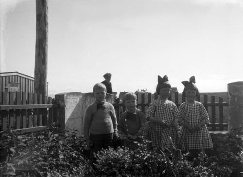 Fjögur börn standa í garðinum á Túngötu 20, horft til suðurs. 1) væntanlega Geir Þosteinsson 2) Hannes Þorsteinsson (synir Þorsteins Þorsteinssonar og Guðrúnar Geirsdóttur) 3) Bryndís 4) Helga. Fyrir aftan þau sést maður á reiðhjóli (hreyfður) sem er að fara upp Túngötuna og lítur í átt að myndavélinni. Vinstra megin á myndinni er grindverk, skúr og staur. Bakvið börnin sést í hús í fjarska hinum megin við Landakotstúnið.