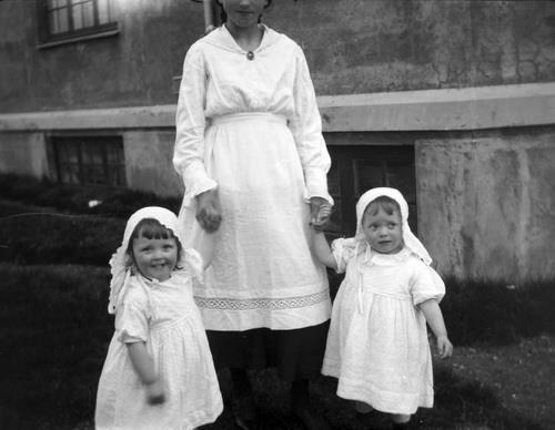 Tvíburarnir Helga og Bryndís leiða sinnhvoru megin konu sem ekki sést í andlitið á. Í baksýn sést ómálaður veggur Túngötu 20. Stúlkurnar eru báðar í hvítum þunnum kjólum með hvítar húfur. Konan er með hvíta svuntu.