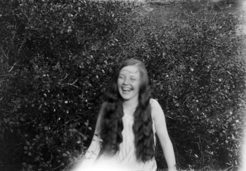 Væntanlega Helga Zoëga skellihlæjandi situr í rjóðri. Birkitré í bakgrunni. Hún er í hvítum ermalausum kjól og með slegið hárið. Myndin er hreyfð.