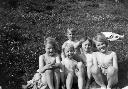 1) væntanlega Dagný Valgeirsdóttir 2) Ingileif 3) Hallvarður Valgeirsson 4) Áslaug 5) væntanlega Björg Valgeirsdóttir. Börnin sitja saman í hnapp að því er virðist nakin. Gróður í kring.