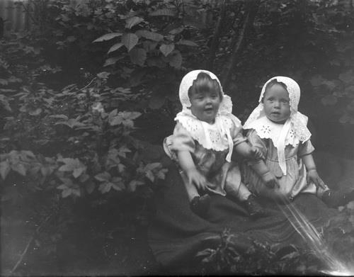 Tvíburarnir Helga (vinstra megin) og Bryndís (hægra megin) sitja á teppi úti fyrir. Þær eru í eins kjólum með hvíta kraga og hvíta þunna hatta. GLERPLATA.
