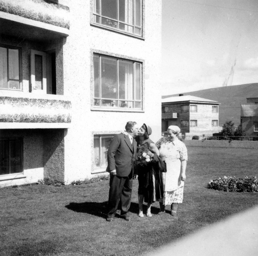Jón Kristjánsson og Lovísa fagna með dóttur sinni í garðinum að Þingvallastræti.