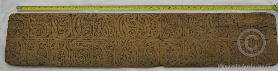 Rúmfjöl. Útskorið á hana stafrófið með skrautletri. Einnig ártal í rómverskum tölum og fangamark B.S.S. Ártalið MCCIIIL mun vera 1847. B.S.S. stendur fyrir Björn Skúlason sem kenndur hefur verið við Bóndastaði á Úthéraði. Úr eigu Vigfúsar Sigurðssonar frá Egilsstöðum í Fljótsdal (f.03.08.1880 d.13.09.1943).