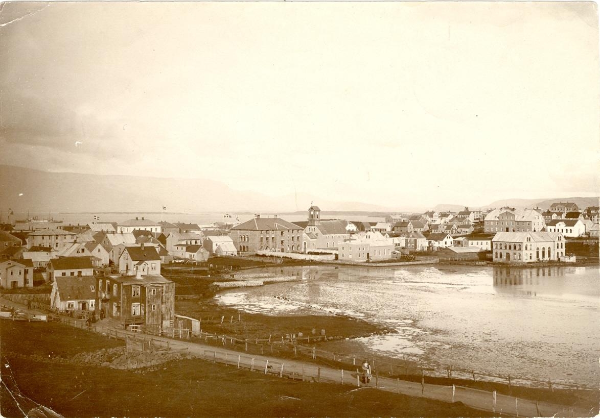 Yfirlitsmynd af norðurenda Tjarnarinnar og bygg í Kvosinni.