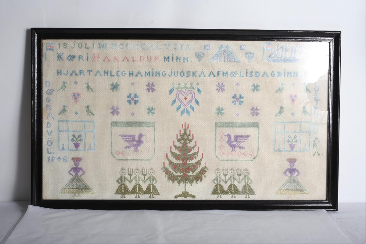 Útsaumuð afmæliskveðja - innrömmuð undir gler í tréramma. Þar stendur "Kæri Haraldur minn. Hjartanleg hamingjuósk á afmælisdaginn þinn". Hlutinn átti Helga Símonardóttir, fóstra Haraldar Sigurðssonar, gefanda.