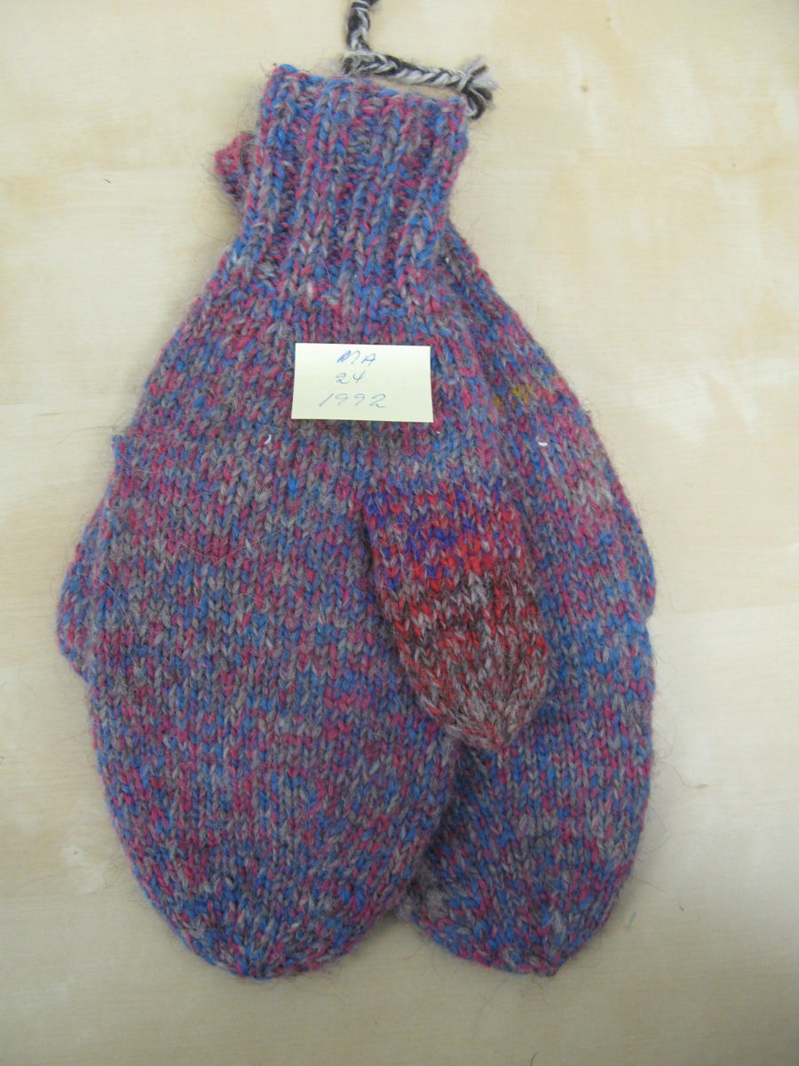 Tvíþumla ullarvettlingar. Úr þreföldu bandi, rauðleitu, bláu og gráu. Eru ónotaðir. Voru í búi Fannýjar Kr. Ingvarsdóttur og Gísla Kristjánssonar, Herjólfsgötu 22, Hafnarfirði, sem eitt sinn bjuggu á Bjargi í Neskaupstað.