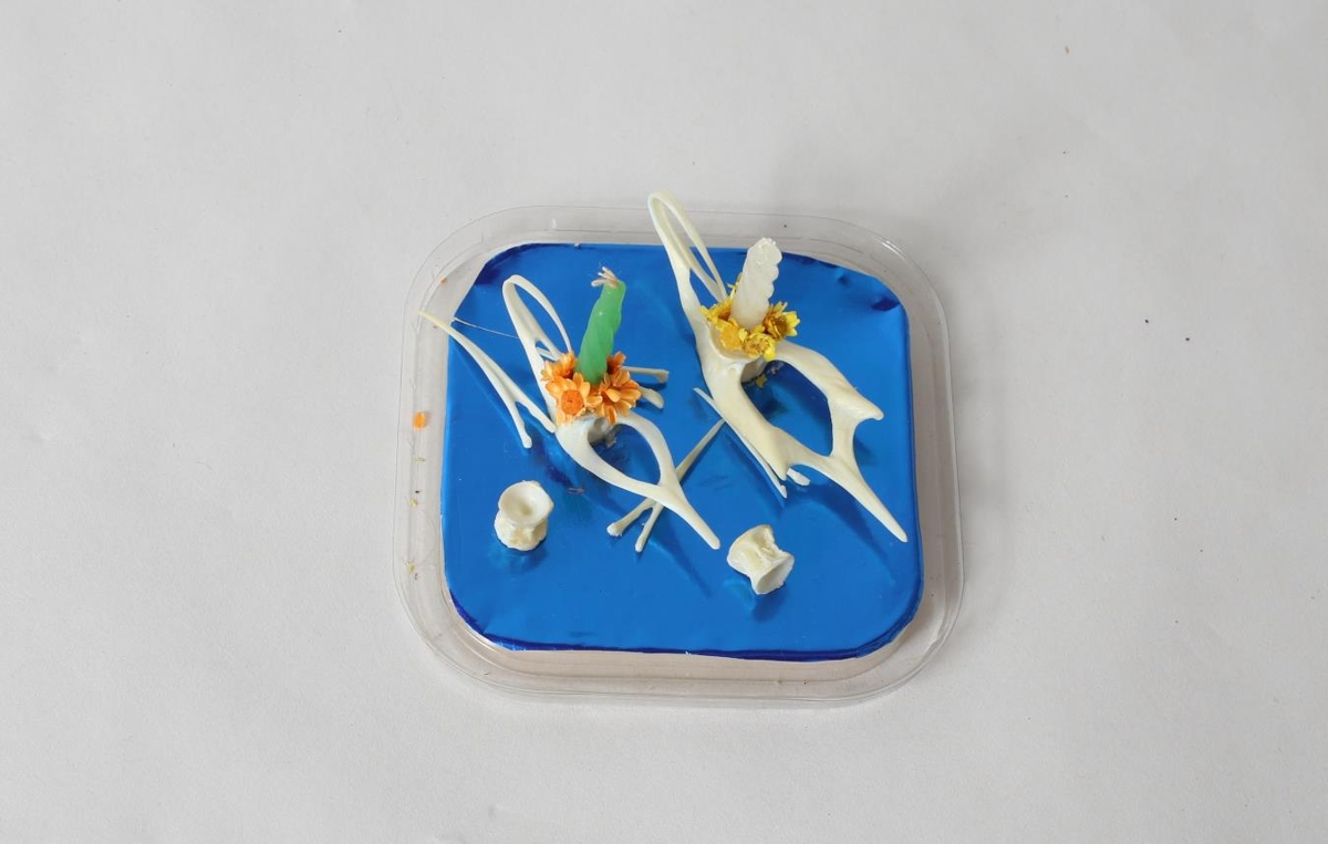 Skreyting í glærri plastöskju. Eru tveir stjakar með hvítu og grænu kerti í hvorum. Grænt kerti með appelsínugulum blómum, og hvítt með gulum blómum. Á bláum grunni. Systir Guðmundar frá Lundi, Guðbjörg Þorsteinsdóttir gerði.