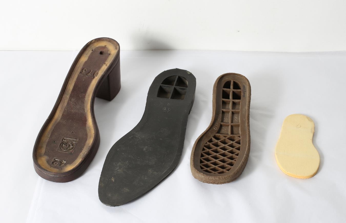 Fjórir skósólar. a) nr. 33 barnaskór; b) nr. 42 dömuskór; c) nr. 45 herraskór; d) nr. 23 barnaskór. Úr þrotabúi skóverksmiðjunnar Agilu Egilsstöðum er starfaði á árunum 1970-1975. Framleiðandi: Agila.