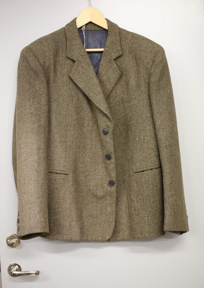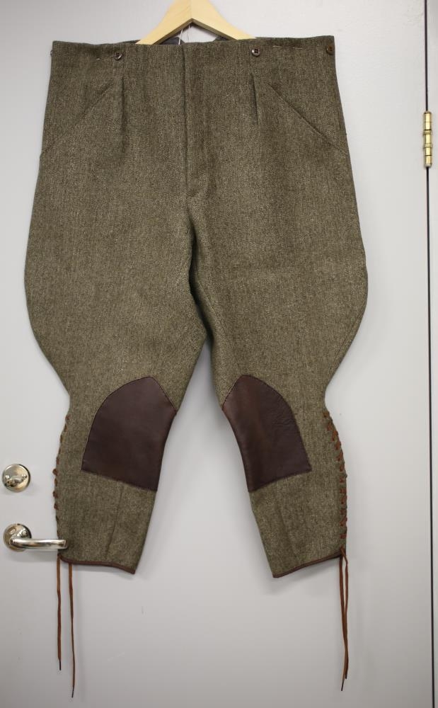 Brúndröppuð reiðföt, notuð á hestaferðalögum. Venjulega einn hnepptur jakki. Reiðbuxur með tölum fyrir axlabönd, reimaðar á hliðunum (skálmunum) og leðurbætur innanlæra. Fötin lítið sem ekkert notuð, heimasaumuð með miklu og fallegu handbragði, s.s.nestur o.fl. Haraldur Sigurðsson (f. 1900, d. 1976), læknir í Fáskrúðafjarðarhéraði 1940-1970, lét sauma á sig fötin en fékk bíl skömmu síðar, þar af leiðandi voru fötin lítið notuð. Sennilega saumuð á bilinu 1947 til 1949.