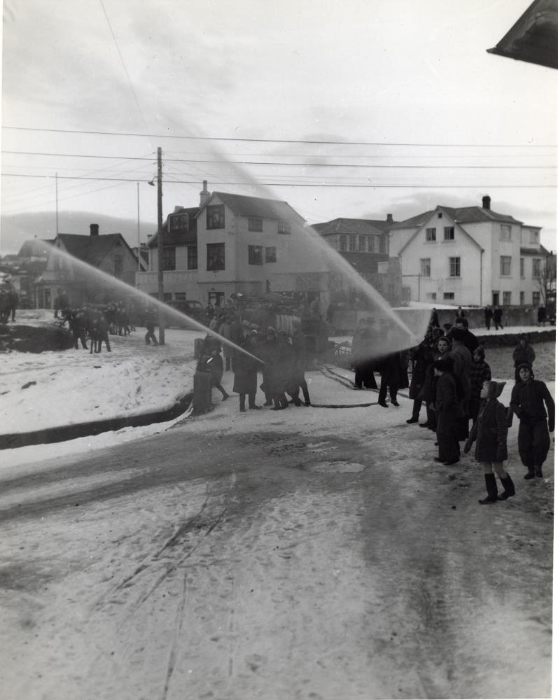 Slökkviæfing við Lækinn , þarna er kominn slökkviliðsbíll.
