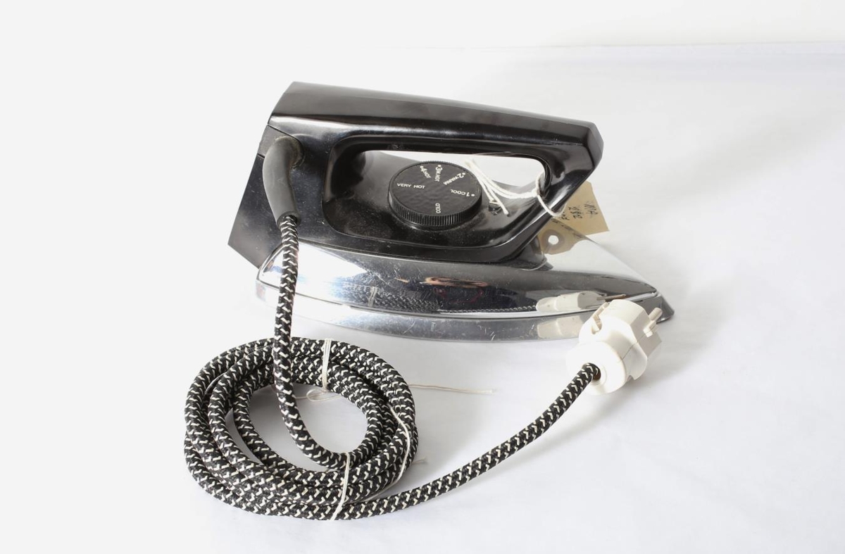 Rafmagnsstraujárn, stállitað með svörtu haldi. Snúra hvít og svört.