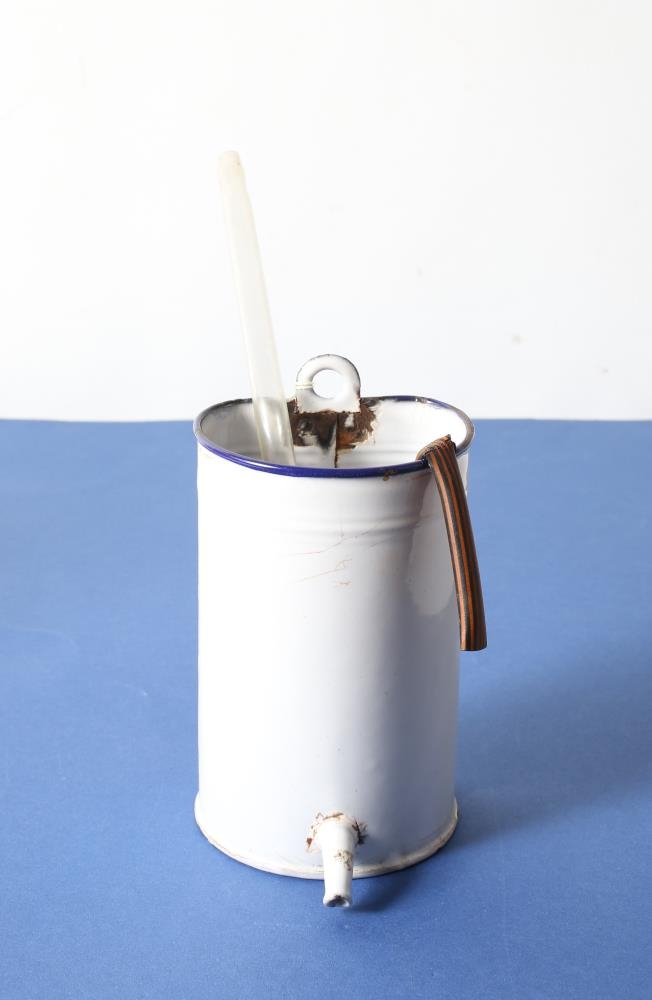 Hvítur, emeleraður, hár dallur með blárri rönd efst og stút neðst. Röndótt, mjó slanga samankrumpuð ofan í. Frá Gilsárstekk í Breiðdal.