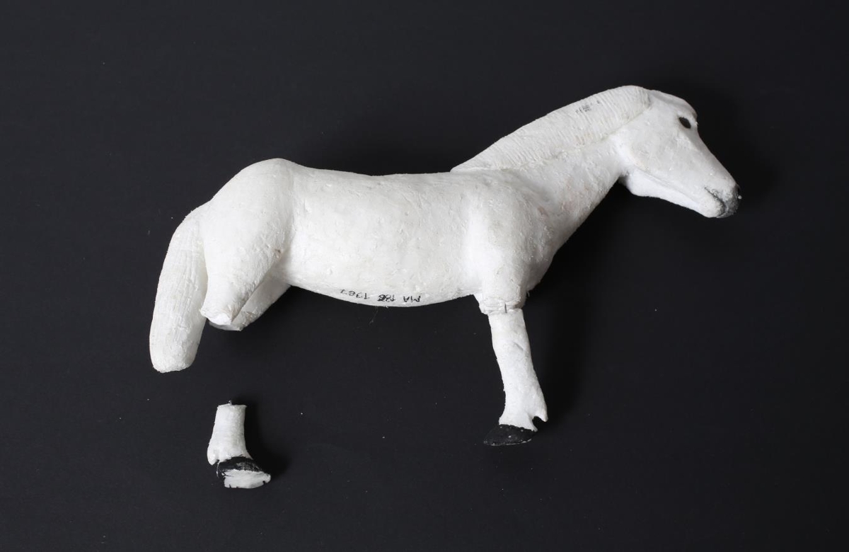 Hestur úr hvítu einangrunarplasti, fótbrotinn á öllum. og eru tvö brotin með. Guðmundur Þorsteinsson frá Lundi skar út talsvert af dýrum í kork og við. Þessi voru á vinnustofu hans þar sem hann gerði við gamla hluti.
