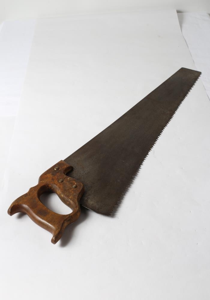 Þverskeri. Sög, stórtennt með tréhandfangi. Júlíus átti sögina og smíðaði á hana skaftið.