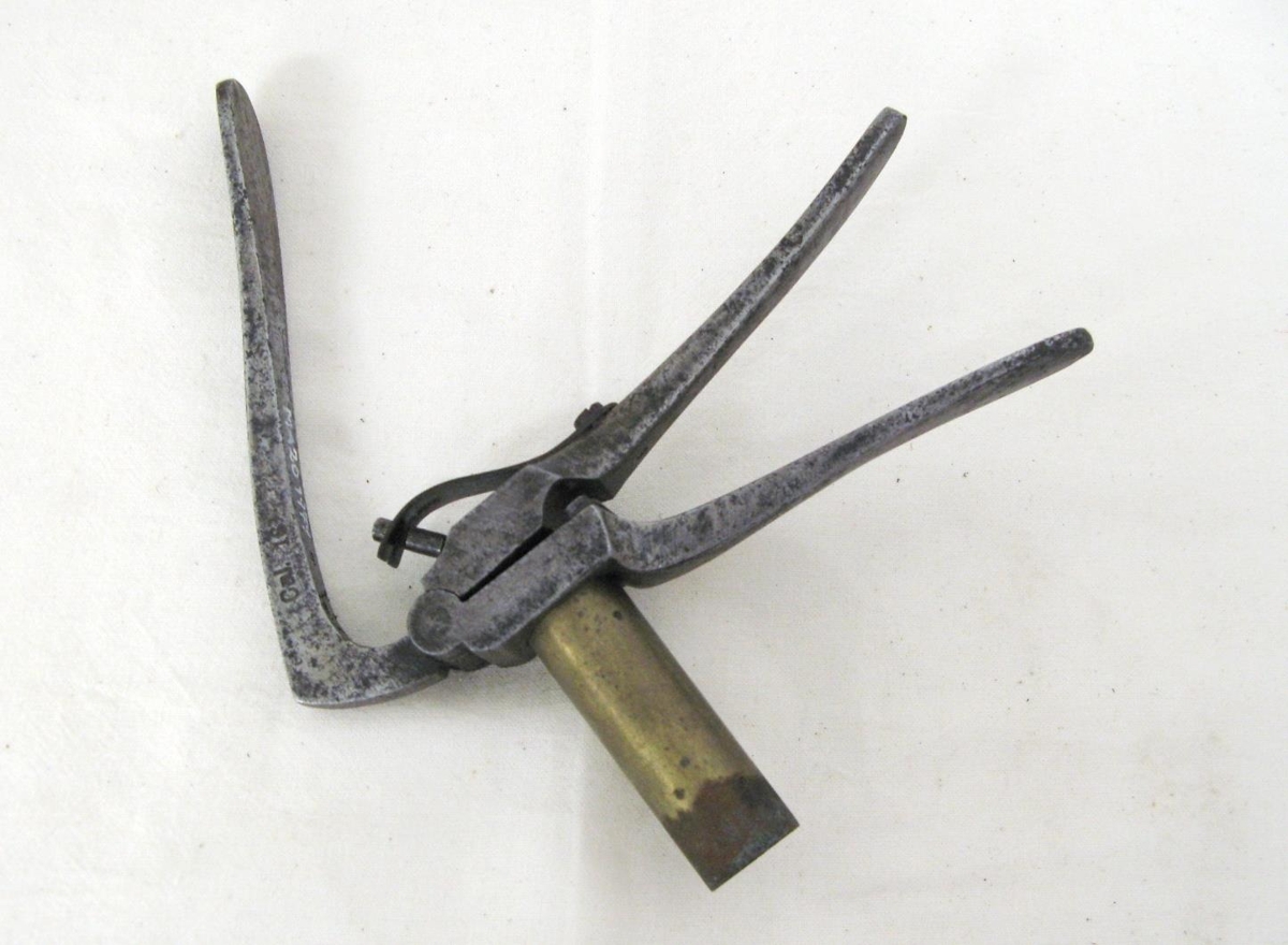 Efsta skaftið með gati fyrir patrónuna þar sem henni var stungið í gegn. Þar undir var annað skaft sem kom undir botninn á patrónunni. Upp í gegnum botninn kemur pinni sem rekur hvellhettuna úr. Neðan á þetta skaft sem fest er á þráð sem heldur pinnanum. Þar undir er skaft sem ýtir á allt saman. Notuð við að búa til hvellhettur.